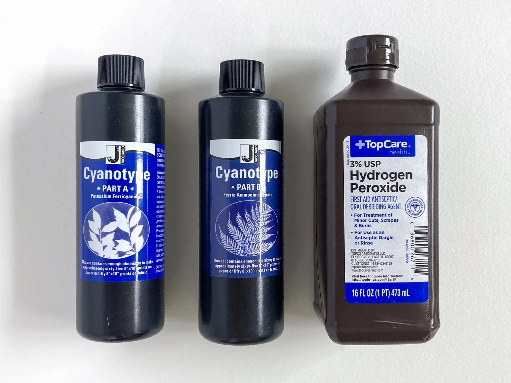 Cyanotype chemicals - Jaquard is a popular brand and probably the most accessible. You can find this at almost any craft store or you can get it directly from Amazon. Photographers Formulary from B&H Photo is also a great brand. Bostic and Sullivan is a site that carries a variety of alternative process chemicals and you can get some of them in granules that you mix with water yourself, including cyanotype. This can be useful because it holds a little bit longer shelf life. Besides the basic chemicals for cyanotypes, you will also need a bottle of hydrogen peroxide. This is what gives you the deep blue color tones. It doesn't need to be anything fancy, just your basic drugstore brands will work.